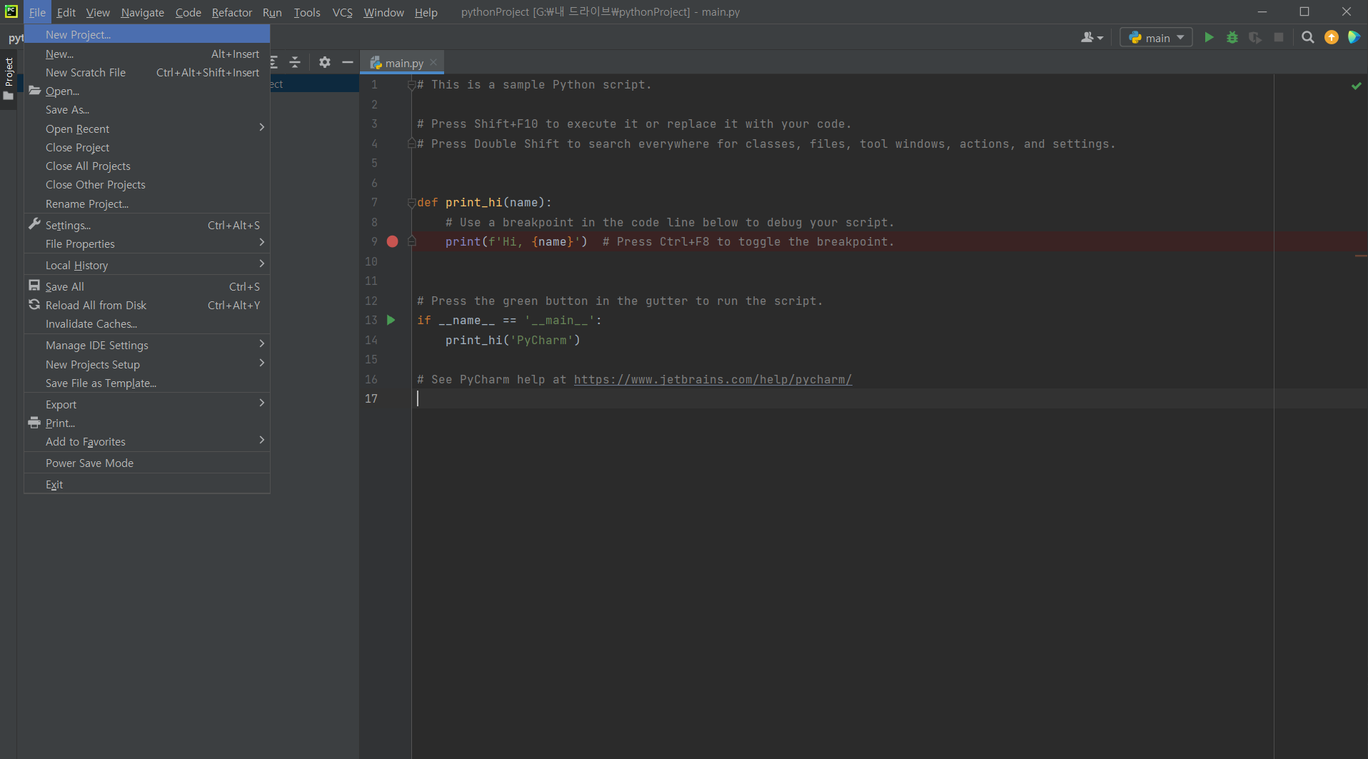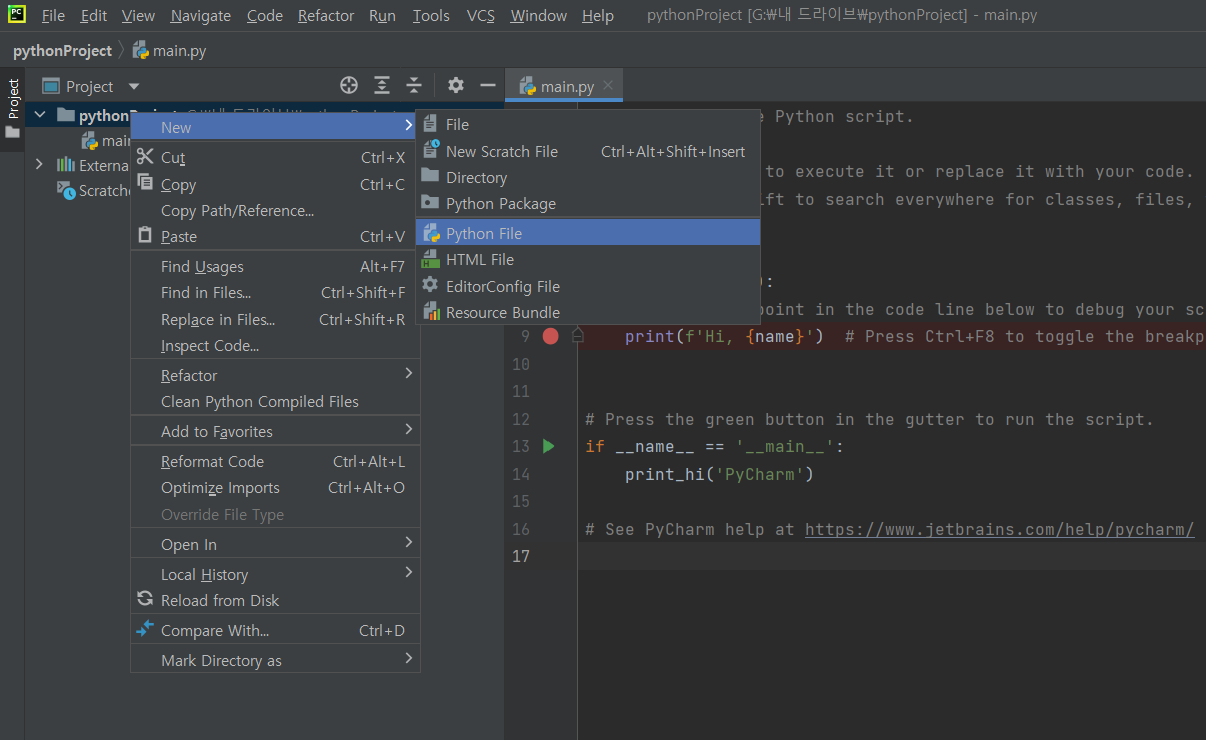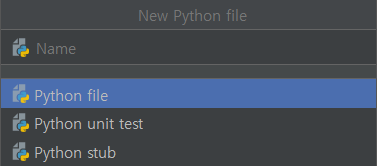 적용했다면 새 프로젝트가 생성이 될 것이다. 그리고 우측 상단에 보면 main에서 컴파일이 된다고 나와있는 것을 볼 수 있다. 하지만 우리는 main에서 컴파일하는 것이 아닌 다른 파일을 컴파일할 것이므로 python file을 생성해 준다. 생성하고 싶은 위치에서 우클릭 후 New -> Python File을 누르면 다이얼로그가 작 게뜨는데 원하는 이름 적고 생성을 해준다.