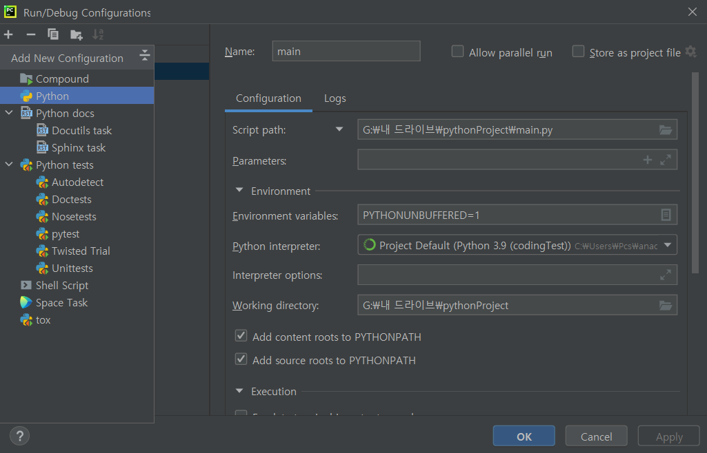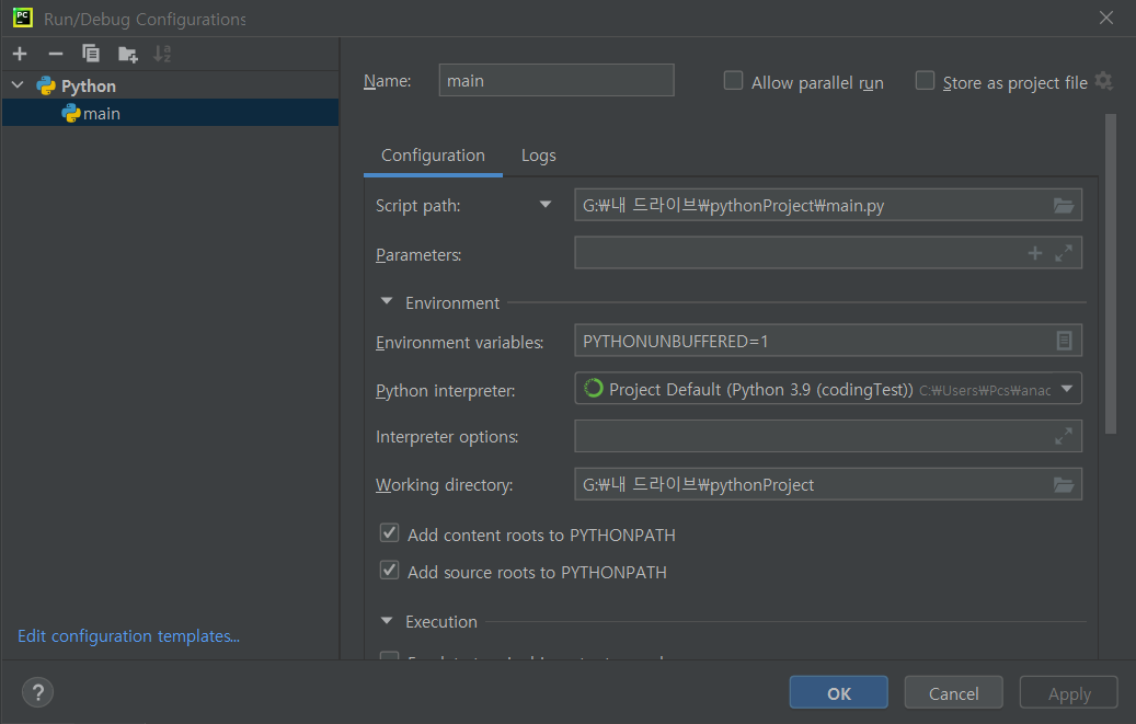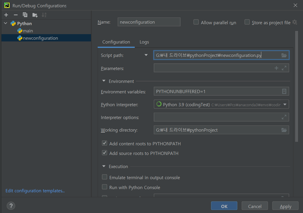 이렇게 설정해주면 이름도 파일 이름으로 변경이 되어서 자동으로 바뀐다. 다른 걸로 원한다면 이름을 바꾸는 것도 가능하다. 또한 Python interpreter를 클릭해서 원하는 인터프리터도 변경이 가능하다. 그 후 Apply OK를 선택하면 설정이 완료된다!