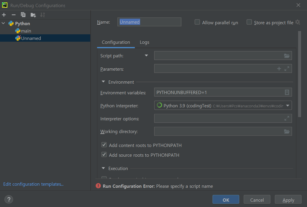 그러면 아래와 같이 새로운 configuration이 만들어진다. Name 설정해도 되지만, 굳이 하지 않아도 Script path만 설정해주면 파일 이름과 같은 이름으로 설정이 된다.