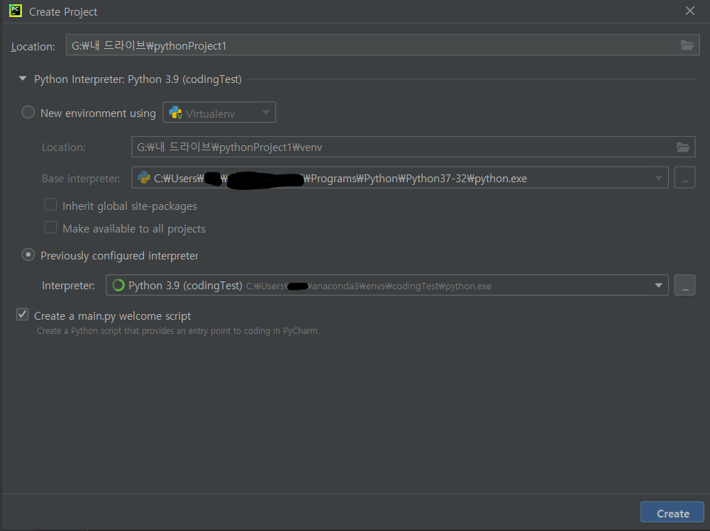 그렇다면 위와 같은 화면이 뜨게 된다. 우측 Create Project라는 창이 뜬다면 저장 위치와 적용할 인터프리터를 찾아주면 된다 만약 인터프리터 설정을 어떻게 하는지 모른다면, 아래 링크 중간 정도에서 인터프리터 적용하는 것을 참고하면 된다.