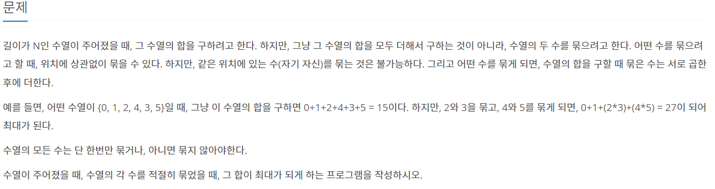 길이가 N인 수열이 주어졌을 때, 그 수열의 합을 구하려고 한다. 하지만, 그냥 그 수열의 합을 모두 더해서 구하는 것이 아니라, 수열의 두 수를 묶으려고 한다. 어떤 수를 묶으려고 할 때, 위치에