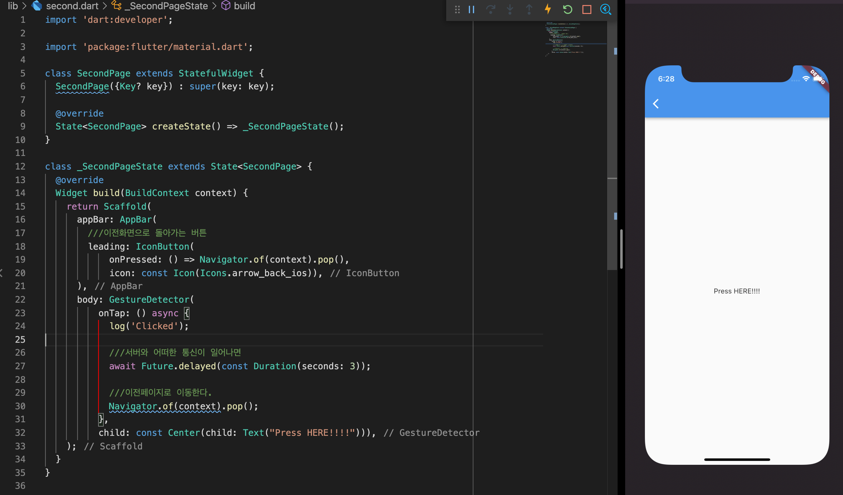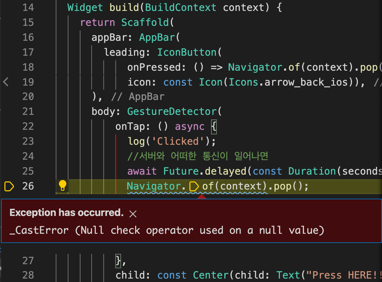 - 현재 페이지가 종료되고 await Future.delay가 종료되고 다음 코드 'Navigator pop'이 실행된다.