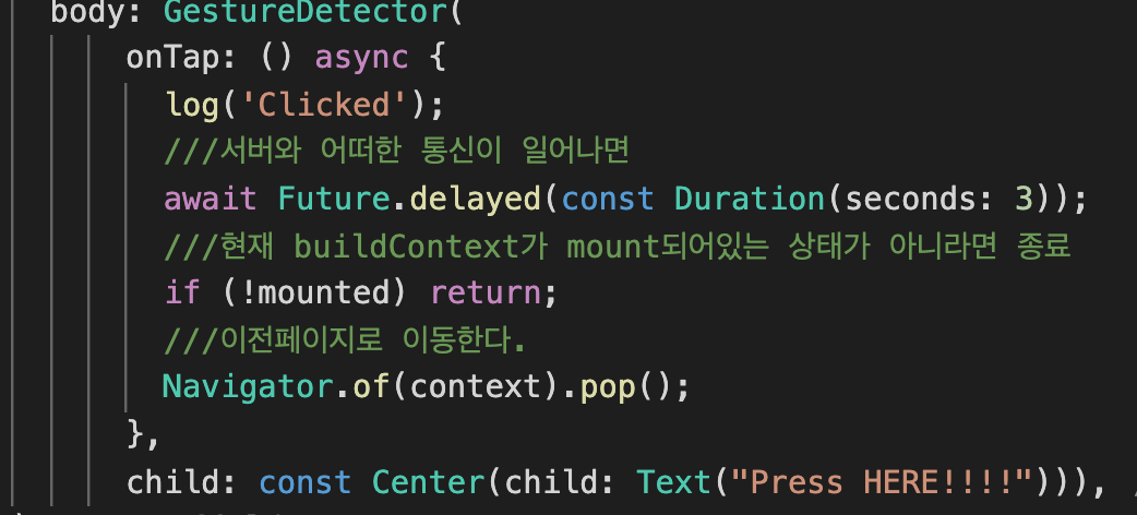 사용자의 클릭이벤트를 GestureDetector의 onTap으로 받아서, onTap은 async를 준 후 그 안에서 await으로 서버와 통신을 처리하고 화면 이동을 하는 코드이다.
