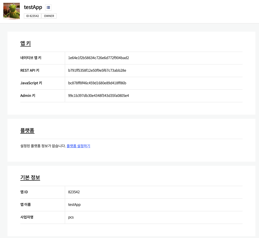 클릭해서 들어가게 되면 이렇게 앱 키와 플랫폼 기본정보에 대해서 나오게 된다.