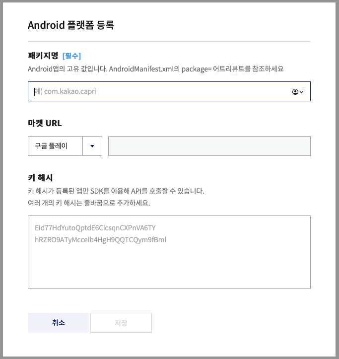 'Android 플랫폼 등록'을 클릭하면 이러한 창이 뜨는데, 친절하게 설명이 다 되어있다. 매니페스트 파일의 패키 지명을 등록하고 마켓 URL과 키해시를 적어주면 된다.