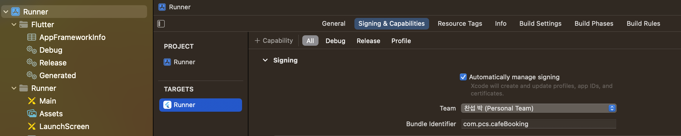좌측에 보면 VSCode처럼 파일이름들이 쭉 적혀있는데 제일 상단에 Runner가 적혀있다. 누르고 TARGETS에 Runner를 누르고 우측상단에 Signing & Capabilities를 누르면 Signing부분에 Bundle Identifier가 있다. 이 부분을 복사하여 붙여 넣도록 하자.