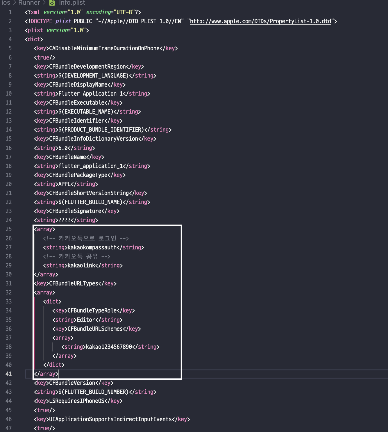 프로젝트> ios> Runner> Info.plist에 흰색테두리 부분이 추가되었다면 완료되었다.