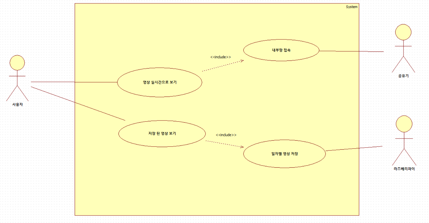 사용자는 영상 실시간으로 보는 것과 저장된 영상을 일자별로 확인할 수 있는 것이다. 영상을 실시간으로 보는 것은 내부망을 접속해야 하는데, 내부망은 공유기를 통해서 접속을 할 수 있게 할 것이다. 물론 외부에서도 접속하여 영상 실시간으로 볼 수 있게 하면 좋겠으나, 당장에 필요한 기능은 아니라고 판단을 했다. 일자별 영상 저장은 RaspberryPi의 Python을 실행시켜 저장을 하게 할 것이다.