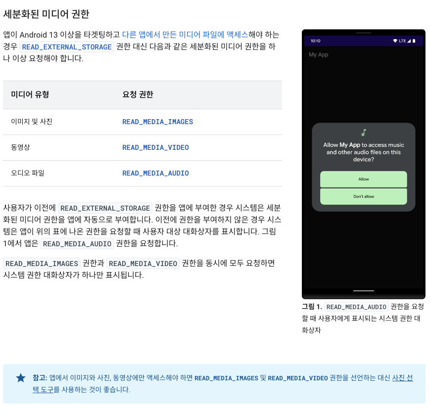 유저의 핸드폰 내부데이터를 세분화되어 권한을 얻어야한다고 적혀있다.