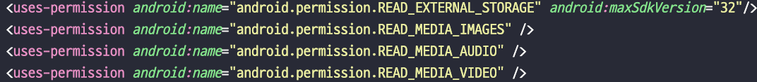 <uses-permission android:name="android.permission.READ_EXTERNAL_STORAGE" android:maxSdkVersion="32"/>