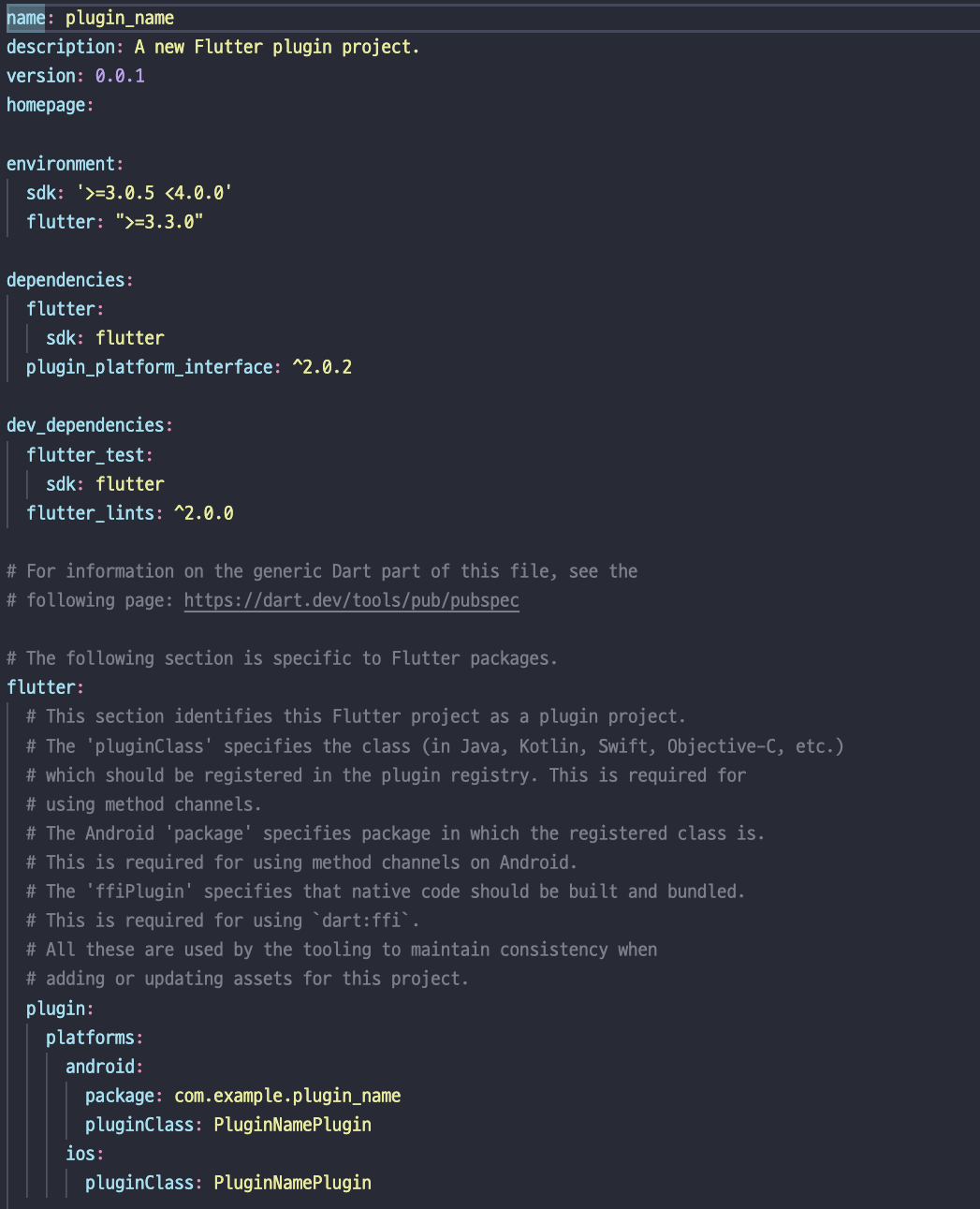 - environment : 현재 만드는 Plugin을 쓸 수 있는 버전을 알려주며, pub.dev에 올릴 경우 다른 개발자가 사용할 때 버전이 맞지 않으면 사용못할 수 있다. 그리고 주의할 점은, 플러그인이 지원하는 플러터 최대버전과 현재 플러터 버전보다 차이가 많이나는 경우는 흔히 볼 수 있는 pub.dev의 스코어 점수에 반영이 되어서 낮게 나올 수 있다.