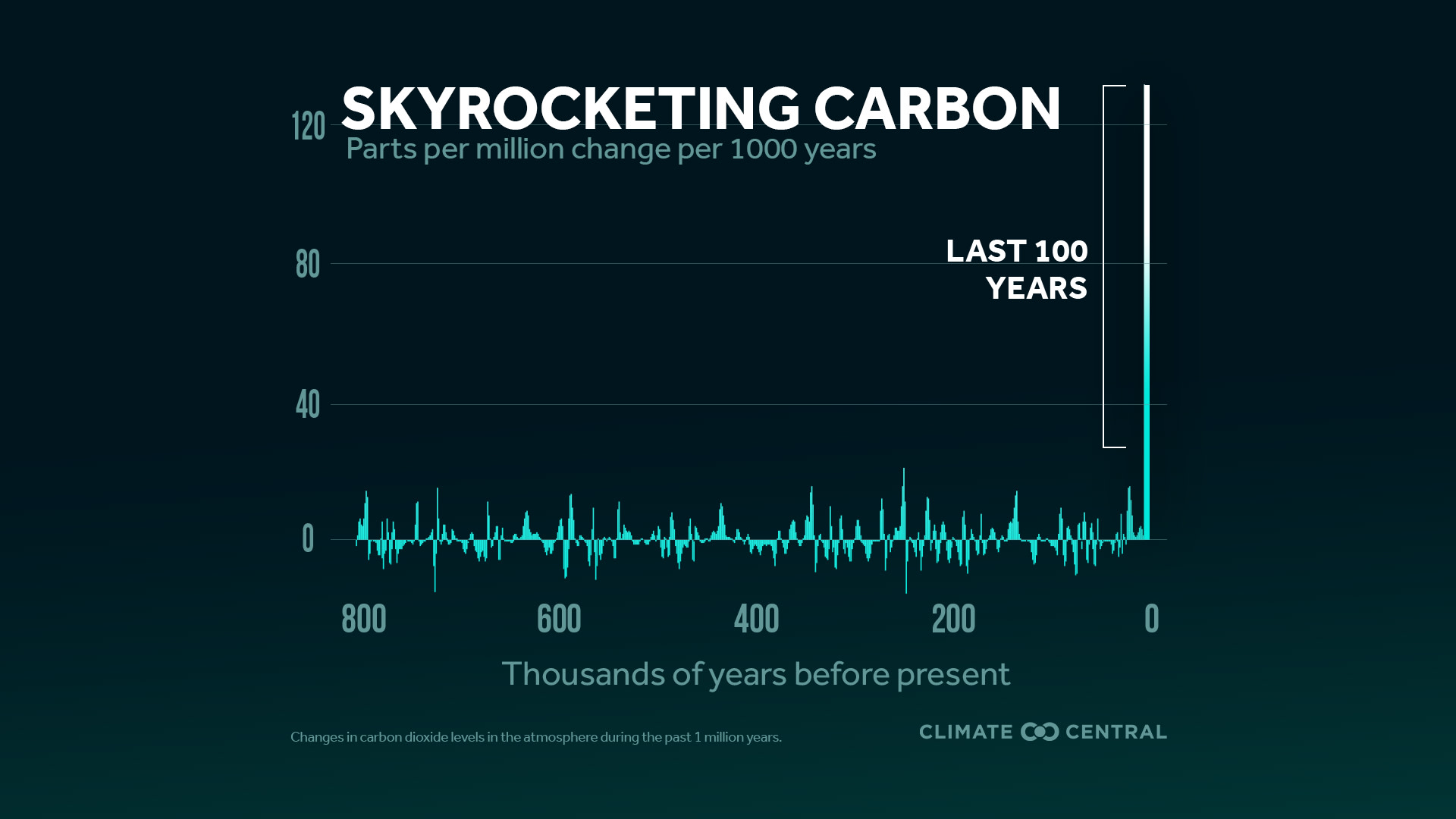 대기의 이산화탄소 농도는 1980년 이후 꾸준하게 증가하고 있다. 물론 누군가는 "이 정도 증가세로는 뭐 괜찮지 않아?"라고 생각할 수 있다. 1985년부터 측정한 데이터로 짧게 느껴져서 그럴 수 있다. X축, 측정일자를 늘린 그래프를 살펴보자.