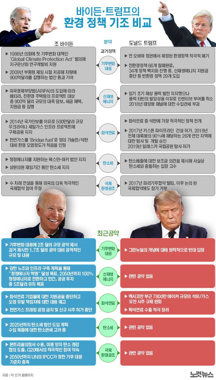 청정에너지에는 관심이 별로없고 화석연료 규제에 오히려 완화를 주장하는 트럼프. 친환경을 적극적으로 밀고 있는 바이든.