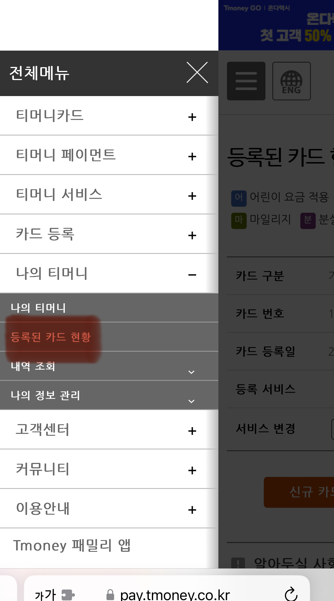 정상적으로 되었는지 확인하고 싶으면 좌측상단에 메뉴를 눌러서 '등록된 카드 현황'을 들어가 보면 된다.