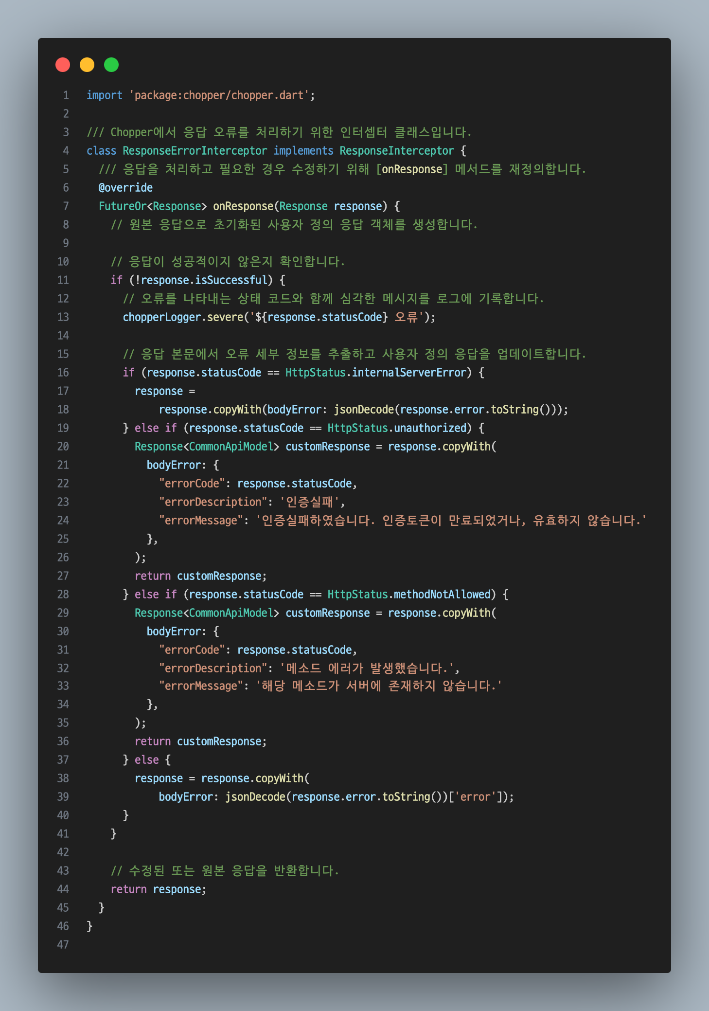Chopper는 API 요청을 편리하게 작성할 수 있는 패키지이다. API호출뿐만 아니라 json 처리도 편리하게 할 수 있으며, 데이터 들어오는 것을 interceptor 해서 처리하거나 Converters가 있어서 데이터 변환에도 아주 편리하다. 이와 비슷한 패키지로는 http, dio, retofit 등이 있고 각 패키지들도 장단점이 있으므로 한 번씩 경험해 보기 바란다. (개인적으로 간단하게 사용하기엔 dio가 편했다.)