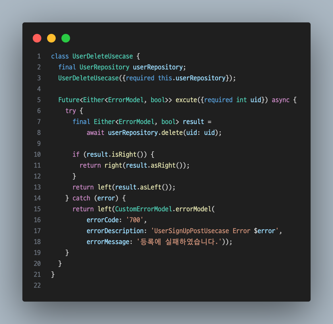 유저의 데이터를 삭제하는 Usecase이다. Either <ErrorModel, bool>을 반환하여, return right를 하면 bool을 반환하고, return left를 하면 ErrorModel을 반환하는 방식이다.